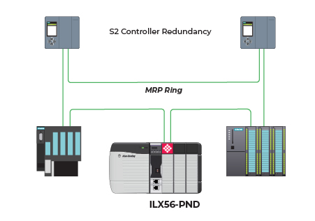 The ILX56-PND also supports media redundancy (using the Media Redundancy Protocol – MRP) as well as PROFINET Controller redundancy (using S2 Controller Redundancy).